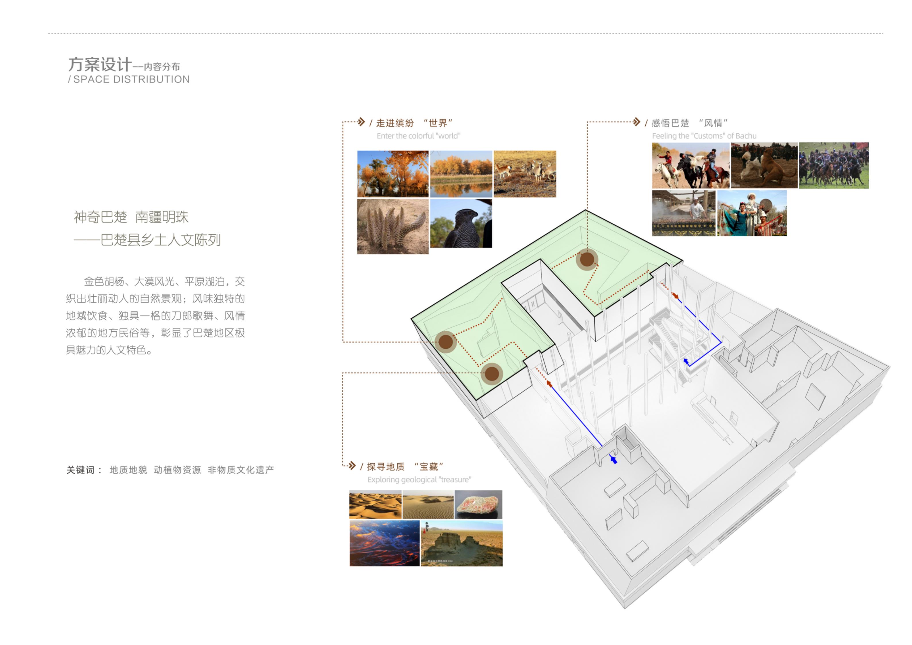 新館呈梯形,是一座高效率的集中式三層建筑。將現(xiàn)代建筑語言和巴楚地域文化緊密結(jié)合。設(shè)置“漢唐巴楚 絲路華章——巴楚歷史文化陳列”、“南疆沃土 水墨綠洲——鄉(xiāng)土人文陳列”、“巴楚百年——巴楚近現(xiàn)代社會(huì)生活發(fā)展歷程展”三個(gè)基本陳列、兩個(gè)臨展廳、一個(gè)報(bào)告廳,并配備專業(yè)文物修復(fù)室和庫(kù)房。