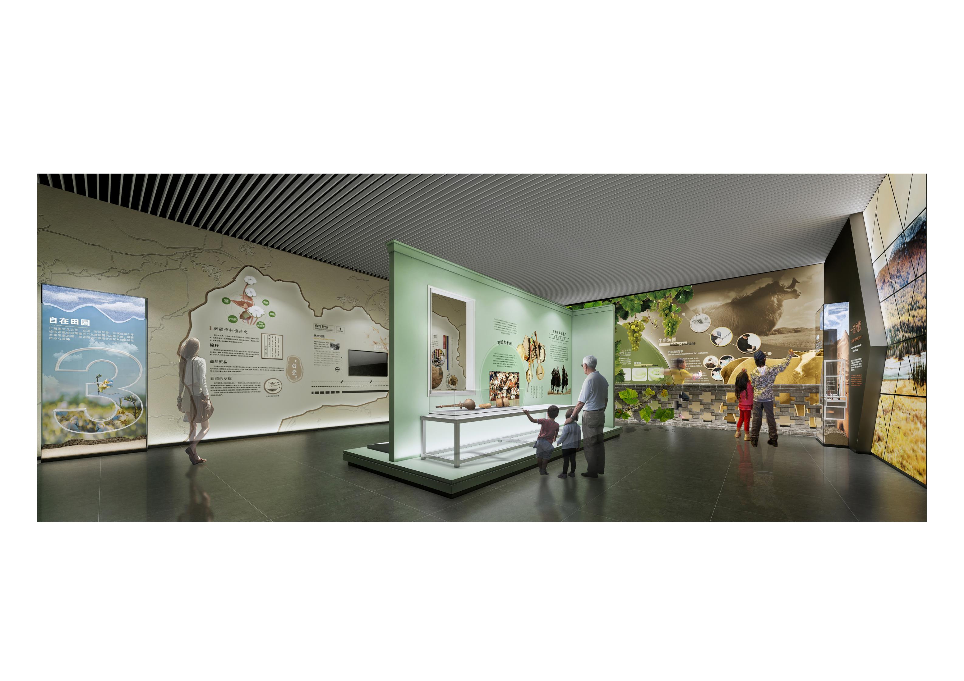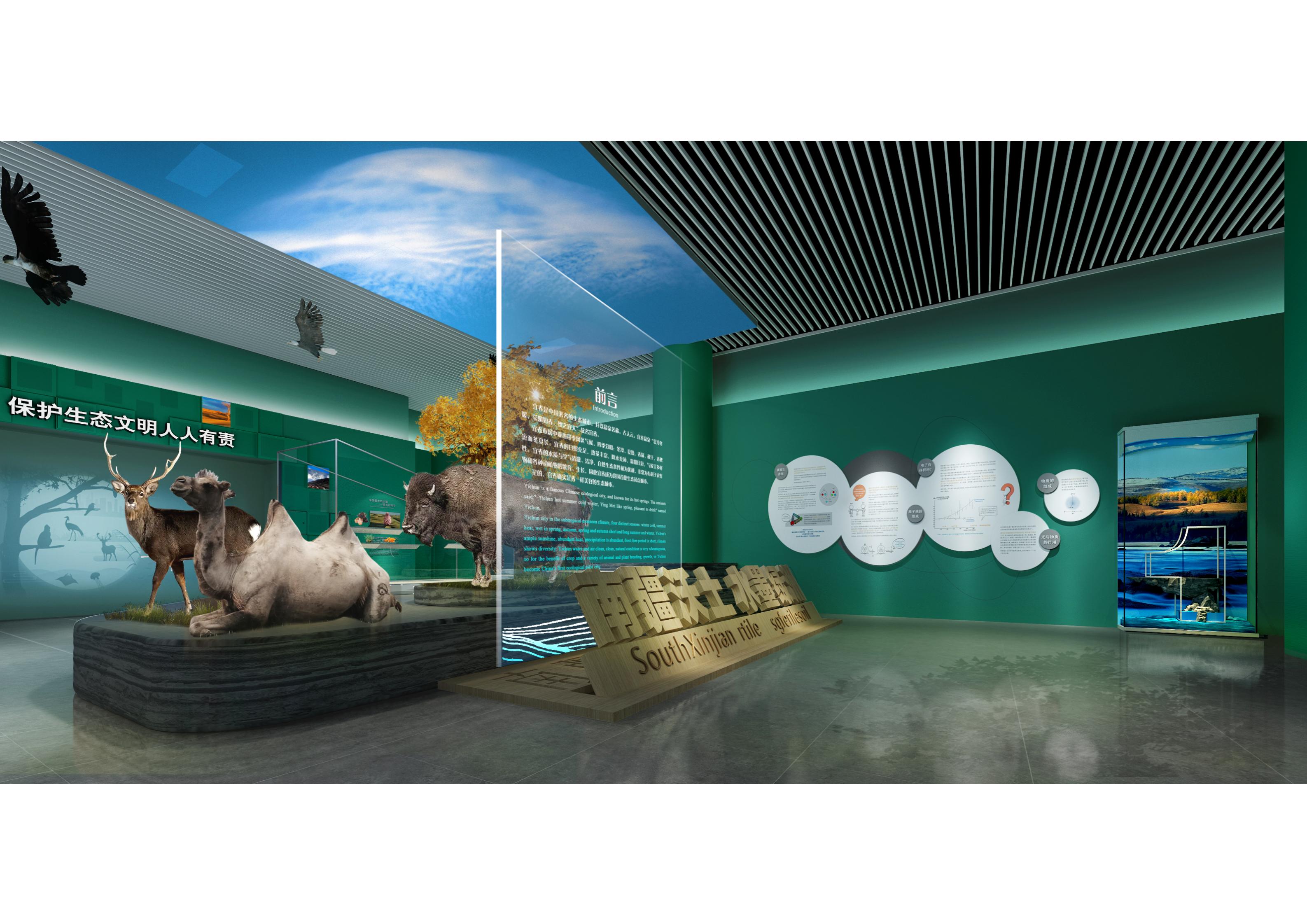 通過巴楚地區(qū)典型民居建筑結(jié)構(gòu)藝術(shù)場(chǎng)景,展現(xiàn)巴楚地區(qū)的風(fēng)情特色,動(dòng)物展臺(tái)生動(dòng)鮮活,礁石、胡楊樹、棉花枝、非遺舞蹈的單片造型作為點(diǎn)綴,豐富展廳空間。